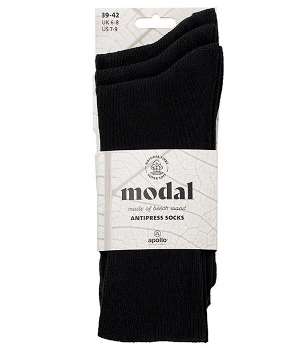 Geniet van deze Apollo Modal antipress sokken met hoog draagcomfort dankzij een extra lange boord met ribstructuur en handgekettelde teennaad. Door het ontbreken van elastiek in de boord biedt dit product een zeer comfortabel en niet drukkend gevoel voor iedere dag. Zeer geschikt bij last van bloedvatenvernauwing, trombose of het vasthouden van vocht. De modal stof kent een fijn gebreide structuur met een hoge slijtvastheid en houdt je voeten droog en fris. De gladde en zijdeachtige stof zorgt voor een luxe en nette uitstraling. Modal is bovendien duurzaam, biologisch afbreekbaar en de productie is minder belastend voor het milieu.