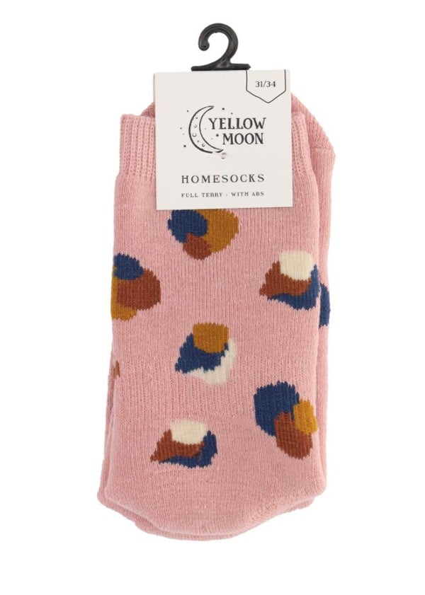 Mooie Home socks van het mooie merk Yellow Moon. Hoofdkleur is rose met bruine, okergele, blauwe en ecru vlekken. Ze bestaan uit 92% Katoen en 8% elastaan. Ze zijn van binnen Full Terry (= badstof), dus ze hebben een hoog draagcomfort. dan hebben ze ook nog een anti slip zool, kortom een zeer goede en mooie Home Sock.